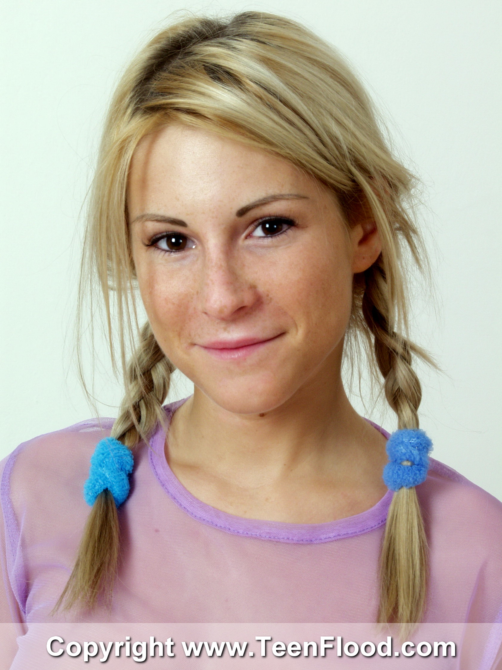 Freckles and pigtails go hand in hand as tools that drive men mad with lust and passion. Nicky Reed has both of these weapons in her arsenal, as well as a lot more. The gorgeous and cute teen has a great smile, as well as a hot set of deep brown eyes. Her sexy blond hair looks great in pigtails and the freckles are just phenomenal. Perhaps her biggest weapons are her amazing set of D cup tits, with succulent nipples to go along with them. Her body is athletic and slender, and her legs are stunning, as is her tasty firm ass. Her pussy and asshole are shaved to perfection, and there are lots of nice close ups to show just how hot and delicious they would be. She has that farmer's daughter charm and aura around her. We're willing to bet a lot of guys would like to take a trip to the barn with Nicky Reed.